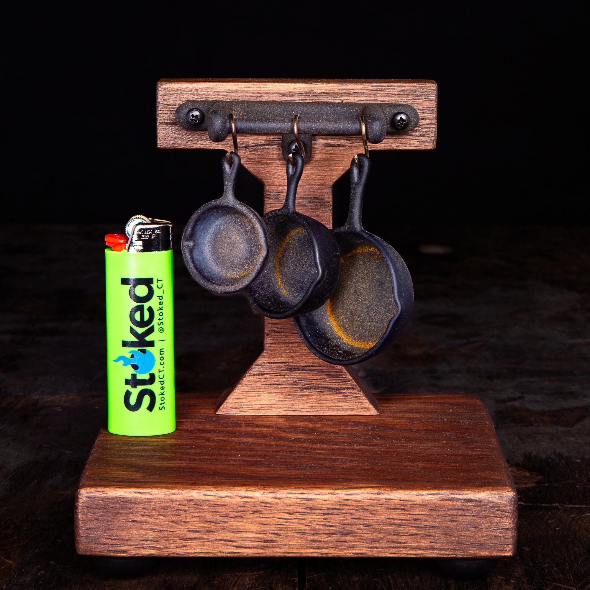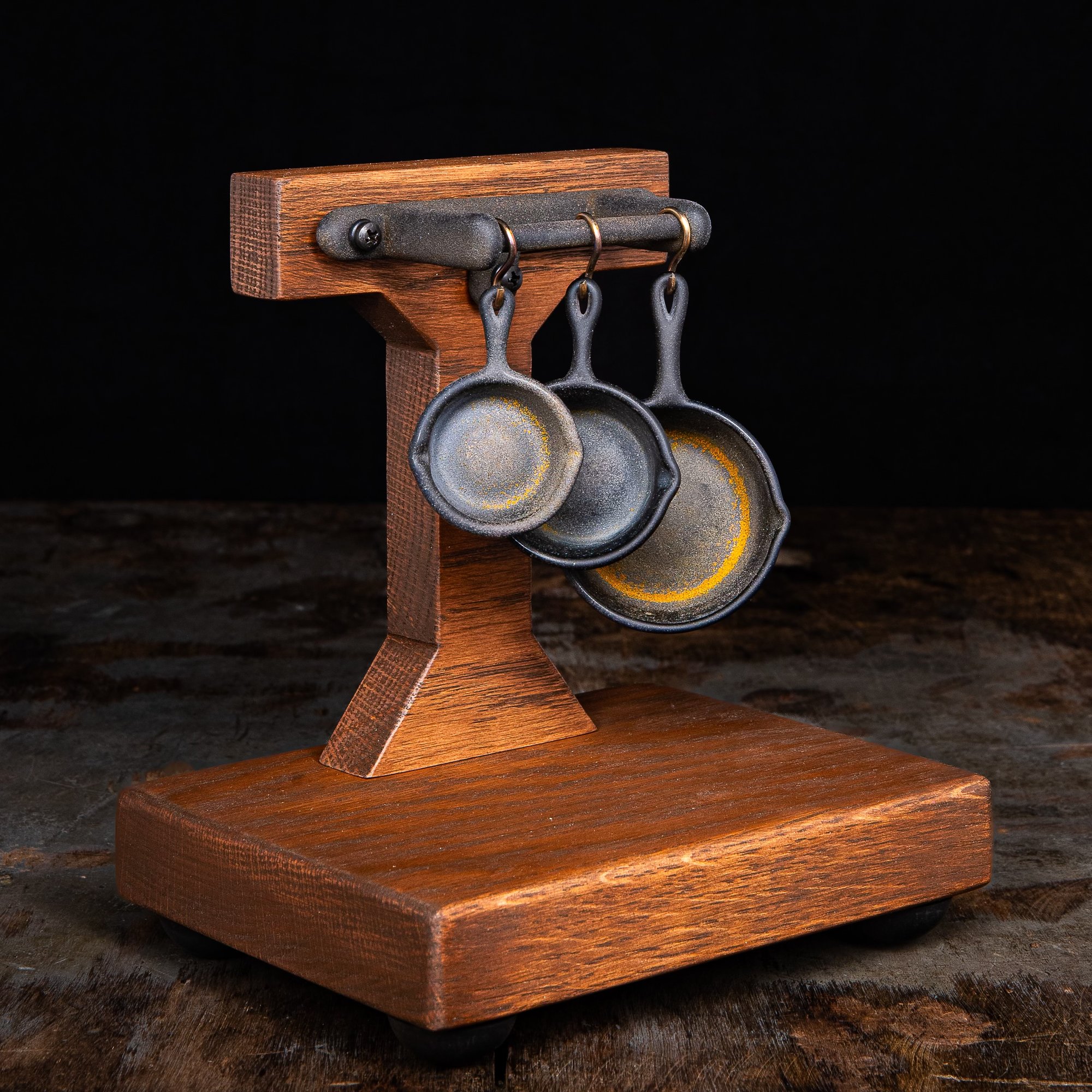 This is the first release in a Kitchenware Series, focusing on cast iron wares. The set includes three miniature glass pans with a bonded steel coating designed to mimic the characteristics of cast iron. Natural rusting and a rough, gritty texture are intentional. These pans are held up by a glass wall rack installed on a handmade white oak stand with rubber footing. The total presentation measures 6×6 inches, and the three pans measure 46 mm, 38 mm, and 30 mm.